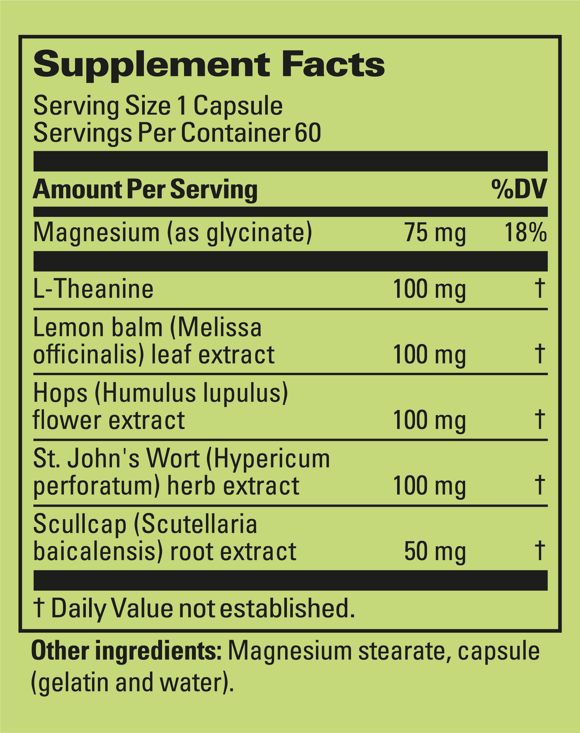 L-Theanine 100 mg; Lemon Balm leaf extract 100 mg; Hops flower extract 100 mg; St. John’s Wort herb extract 100 mg; Magnesium 75 mg; Scullcap root extract 50 mg; other ingredients.
